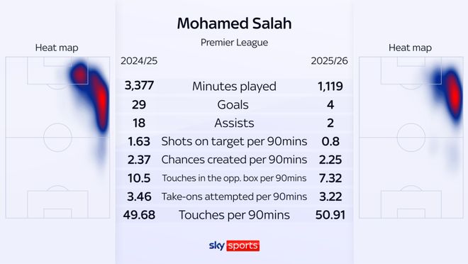 从数据来看,萨拉赫本赛季状态明显下滑,场均射门从1.63次下降到0.8次,场均创造机会、对手禁区内触球、突破次数分别从2.37次、10.5次、3.36次下降到2.25次、7.32次以及3.22次。